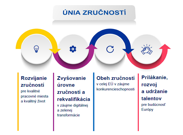 Jedným z nich je koncept „Únie zručností“ (EÚ 2025, s. 3 – 5) predstavuje ďalšiu líniu v jej vzdelávacích politikách. Opiera sa o myšlienku, že „Zdrojom konkurenčnej sily Európy sú jej ľudia. Ľudský kapitál je kľúčom k prosperite EÚ, jej hospodárskej odolnosti a jedinečnému sociálnemu trhovému hospodárstvu. Je kľúčom k zvýšeniu nášho rastu produktivity, vďaka čomu sú naše priemyselné odvetvia konkurencieschopnejšie a majú väčší inovačný potenciál, k prilákaniu ďalších investícií a k dynamickému jednotnému trhu a zvýšenej hospodárskej bezpečnosti. Sústredenie sa na ľudí a investovanie do zručností[1] sa mnohonásobne vypláca. V kontexte globálnej súťaže o talenty a klesajúceho počtu obyvateľov v produktívnom veku v EÚ konkurencieschopnosť Európy závisí od zručností orientovaných na budúcnosť, ktoré prispievajú k hospodárskej sociálnej a územnej súdržnosti. Ľudský kapitál je nevyhnutný aj na podporu pripravenosti a bezpečnosti v súčasnej geopolitickej situácii. Na to, aby bola EÚ konkurencieschopná a pripravená na budúcnosť, musí podporovať svojich ľudí a vybaviť ich zručnosťami a kompetenciami potrebnými na to, aby uspeli vo vzdelávaní, v práci a živote.“