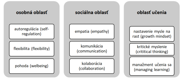 Osobná oblasť | P1 Sebaregulácia: povedomie a riadenie emócií, myšlienok a správania. | P1.1 Povedomie a vyjadrenie osobných emócii, myšlienok, hodnôt a správania. P1.2 Pochopenie a regulácia osobných emócií, myšlienok a správania vrátane stresovej odpovede. P1.3 Rozvíjanie optimizmu, nádeje, odolnosti, vlastnej efektívnosti a zmyslu pre podporu učenia a akcia. |